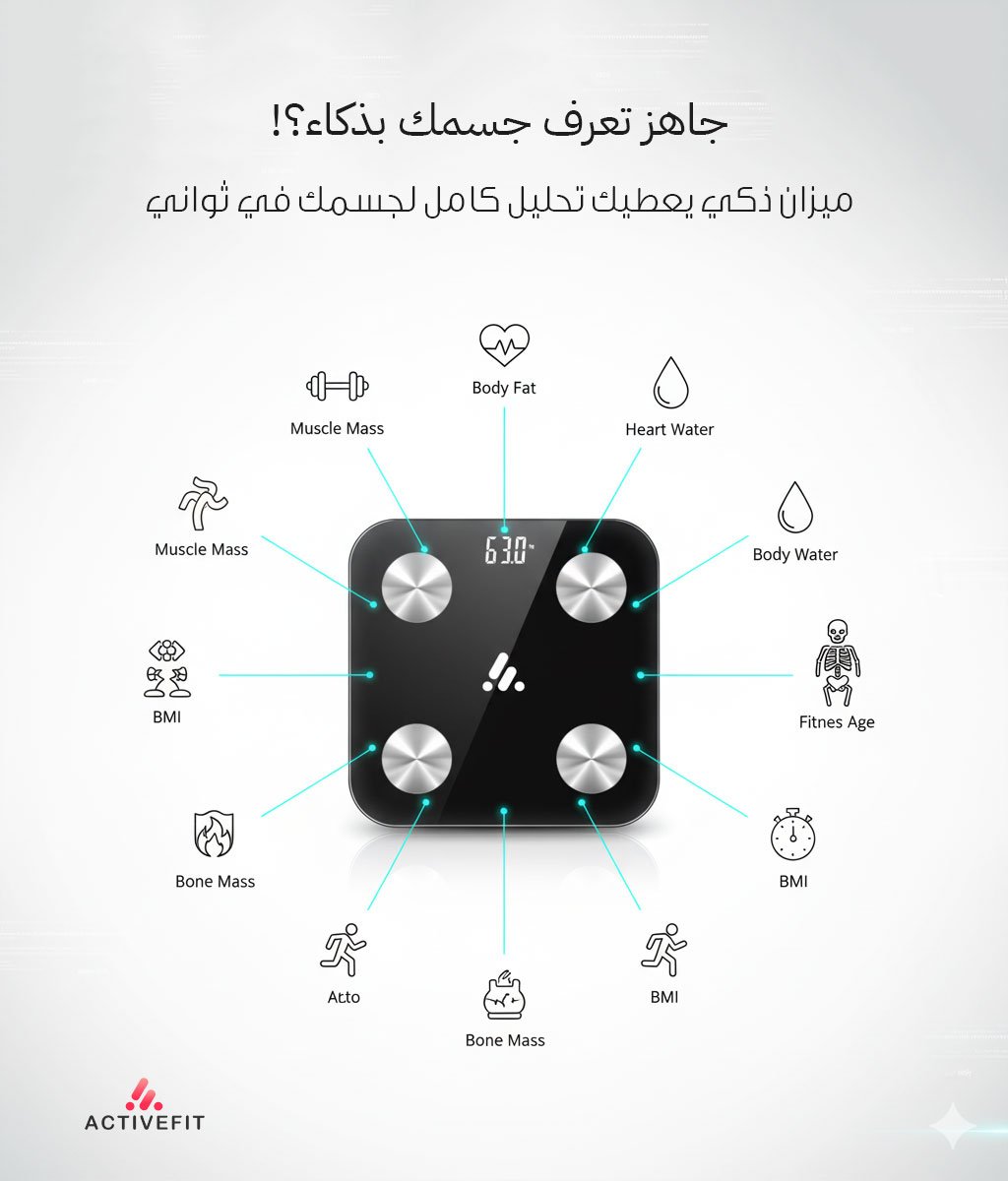 ميزان اكتيف فيت لقياس وزن الجسم ونسبة الدهون بدقة عالية من خلال 16 مؤشراً، مع شاشة رقمية واضحة وتصميم عصري أنيق.