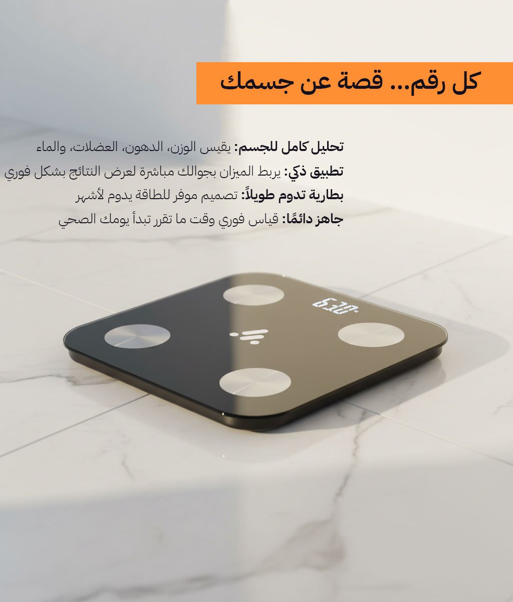 • تطبيق مرافق: يعمل الميزان مع تطبيق مخصص على هاتفك الذكي، حيث يمكنك من خلاله تسجيل قياساتك ومتابعتها بمرور الوقت وتحليل التغيرات التي تطرأ على جسمك.