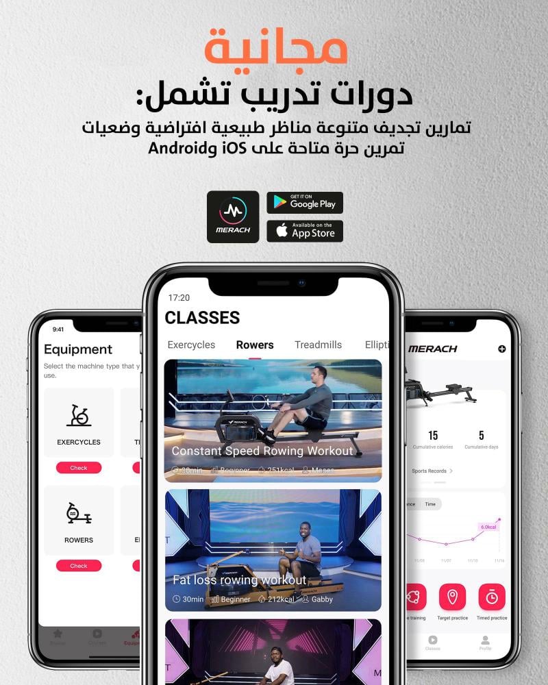 - تمرين شامل للجسم: يركز على تحسين اللياقة القلبية وتقوية العضلات في الجسم العلوي والسفلي مع كل حركة تجديف.